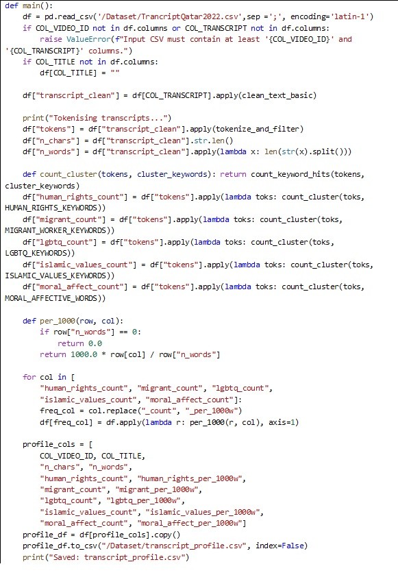 Following this validation process, the dictionaries were applied in a standardized manner across all transcripts to generate comparable descriptive measures. All dictionaries were applied in a case-insensitive manner. For each transcript, the frequency of tokens matching each dictionary was counted and normalized per 1000 words. These measures served as heuristic indicators of issue salience and moral–affective intensity at the video level and as a starting point for the manual framing analysis. The Python code snippet used for the Analysis and Framing of Video Transcripts is presented in Figure 1 (see appendix). The code repository is available at https://github.com/mdidikrw/ams.