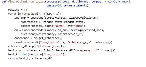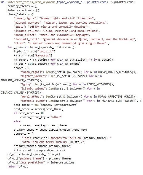 The optimal number of topics for each video has been presented in Table 4. After determining this number of topics, the next step is to identify the keywords and main themes that constitute each of the best topics. This theme extraction process is performed using the Python code presented in Figure 4 (see appendix). The code repository is available at https://github.com/mdidikrw/ams.