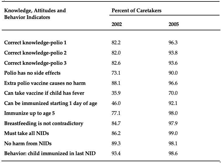 Until 2002, the communication campaign for polio eradication was not able to convince all caretakers of children to immunize their children, resulting in a rise of confirmed polio cases in the country (El-Zanaty and Associates 2002). When the communication strategy and messages were revised, the campaign resulted in a near-universal knowledge and significant increase in the percentages of immunized children, which eventually led to polio eradication from Egypt (El- Zanaty and Associates 2005; polioeradication.org 2020).